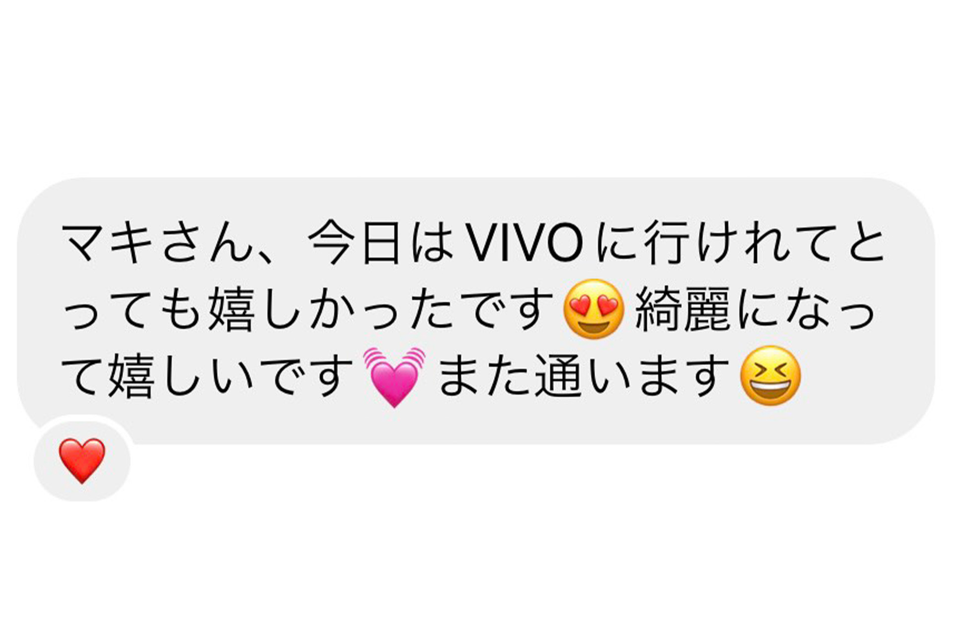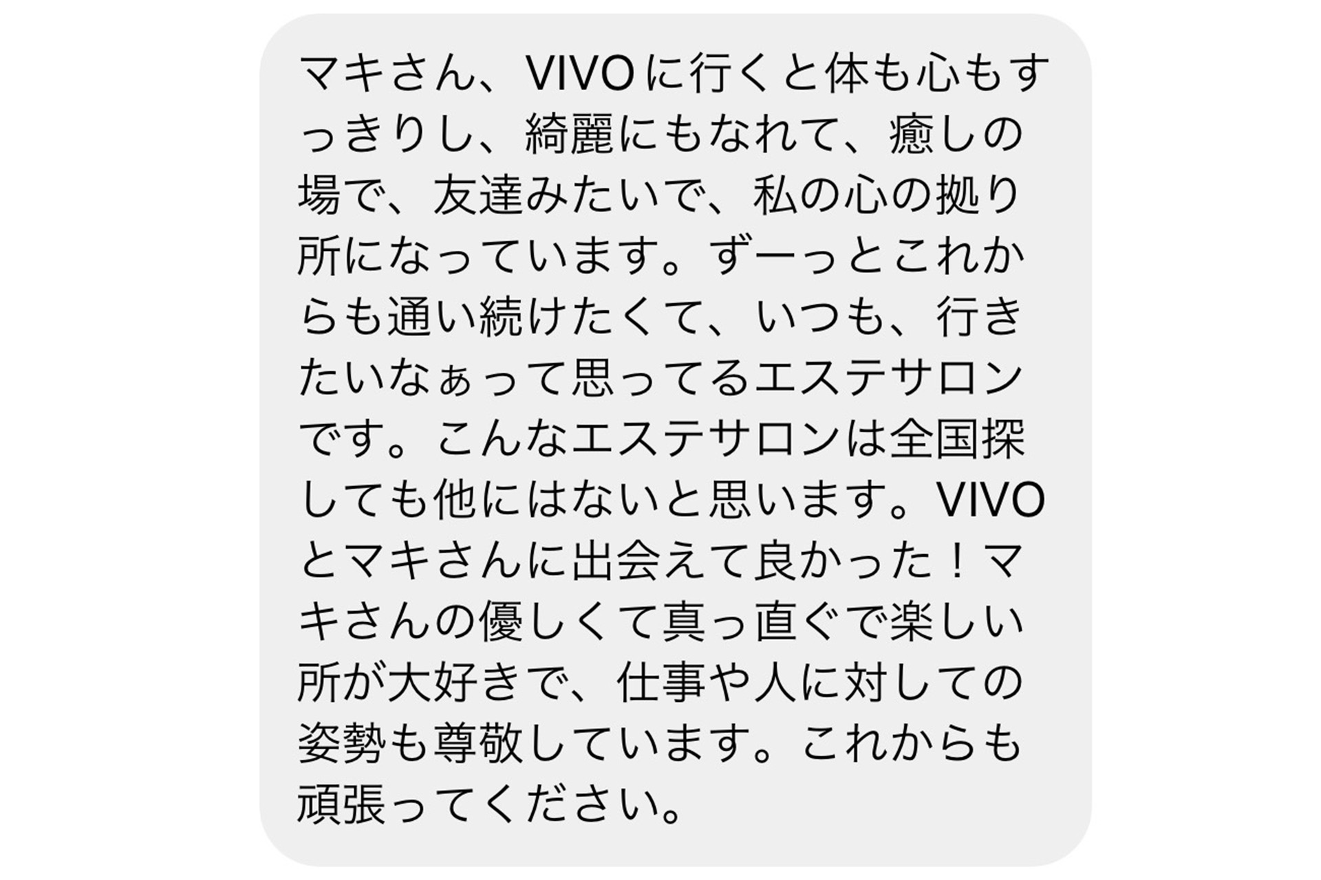 “VIVO(ヴィーボ)“とはイタリア語で『生き生きと、よりよく生きる』を意味します。 その言葉通り、ぬくもりに満ちた癒しの先にある、お肌、カラダ、心のコンディションの変化を実感し、 「今日よりも明日が」心穏やかな充実した日々を送れるそんなきっかけとなるエステをお届けできたらと思っています。 お客様を癒すだけではなく、美しくすることをモットーに、1番の近道の最善の方法であなたが目指す理想の姿へ導いていきます。