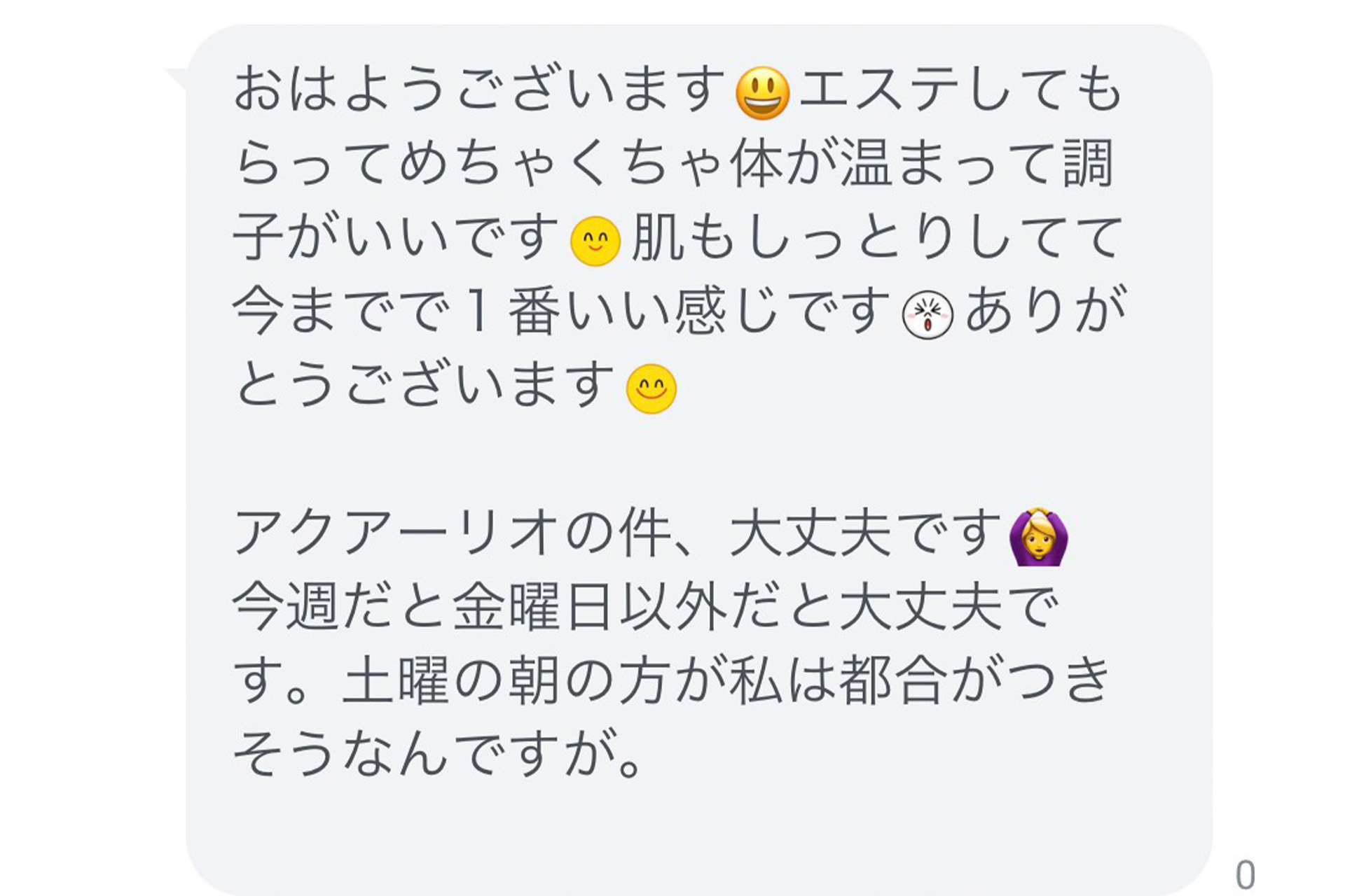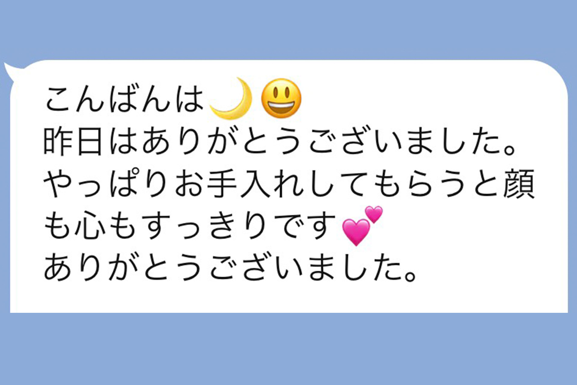 お客様の多くがフェイシャルエステを主軸に定期的にご来店くださっています。完全ご予約制の小さなプライベートサロンだからこそ、お客様一人ひとりに応じたおもてなしとエステティックがご提供できるものと思っています。